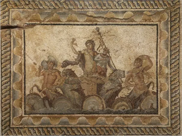 Mosaic depicting the Epiphany of Dionysus (second century AD), found in Dion, Greece, Archeological Museum of Dion.